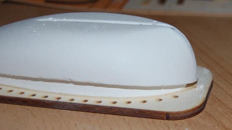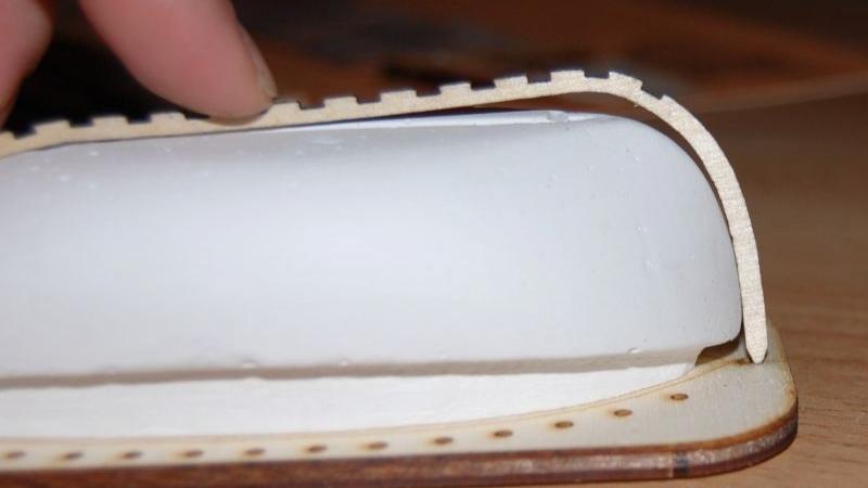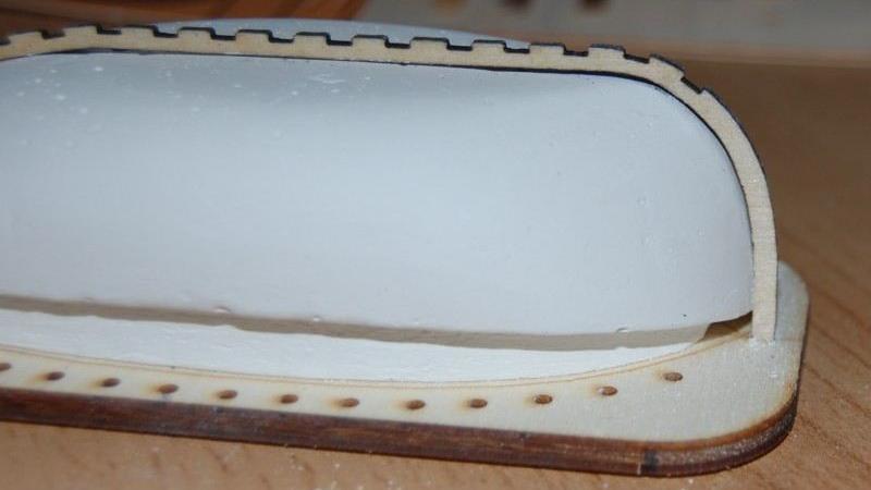 Auch die Nut habe ich noch ein wenig nach vorn verlängert, da sie an der Spitze eine leichte Erhöhung hatte und der Kiel nicht plan aufgelegen hat. Nun passt der Kiel. Leider ist er doch sehr verbrannt durch den Laser.