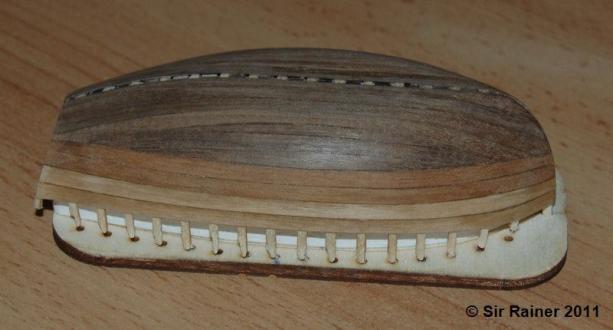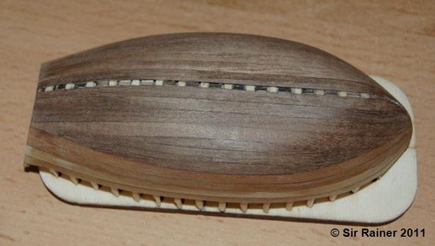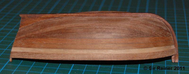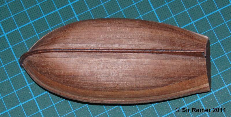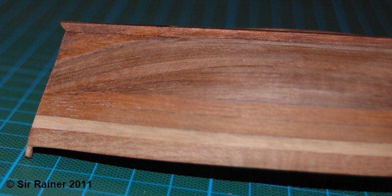 Nun habe ich auch den Originalkiel verbaut. Erst habe ich den Abstand zwischen den Planken so weit aufgefeilt, bis der Kiel von der Breite passte. Auch in der Tiefe wurde etwas rausgefeilt, so weit, das der Kiel ohne Spalt an der Bootskörper passte. Als Farbe habe ich Holzbeize im Farbton Kirsche und Nussbaum verwendet.