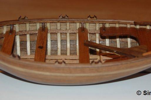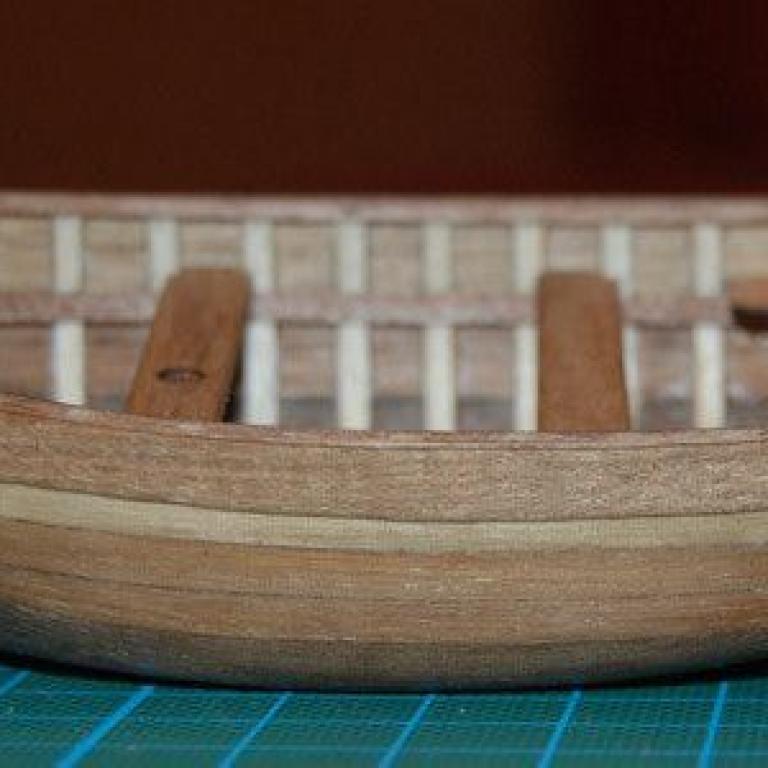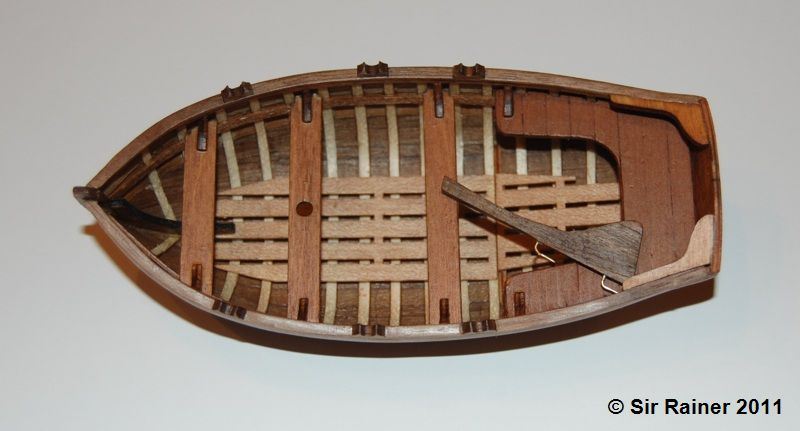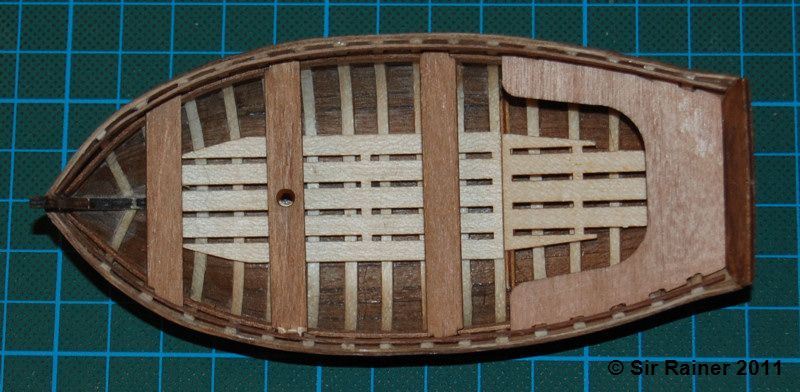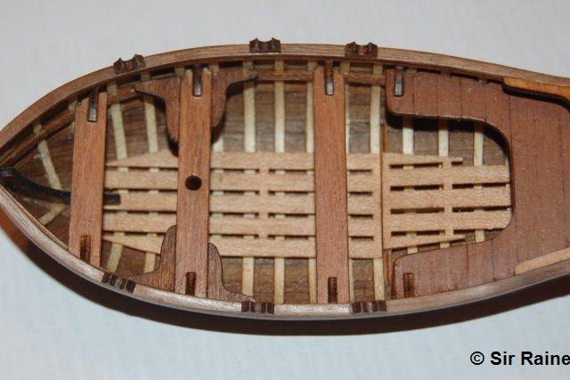 Die Hecksitzbank wurde noch mal etwas verstärkt, so das die Stärke den Sitzbänken entspricht. Das Ruder wurde mit Resten der Beplankung verkleidet und ist fertig. Die Mastbankknie sind nun endlich eingebaut. Ein wenig Sandpapier und Feile angelegt und nun passt alles. Ich habe mich erst zu sehr an die geschriebene Anleitung gehalten, nur die Zeichnungen ansehen bringt viel mehr. In den Bildern war die Lösung. Das ganze Boot wurde mit Seidenmattlack gestrichen. Ich mag diesen seidigen Glanz.