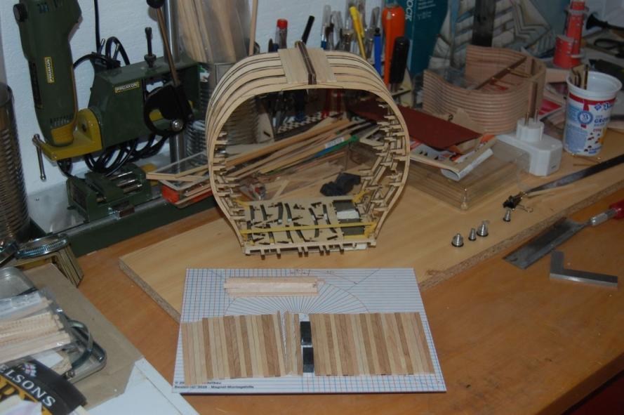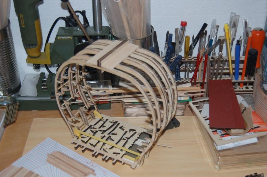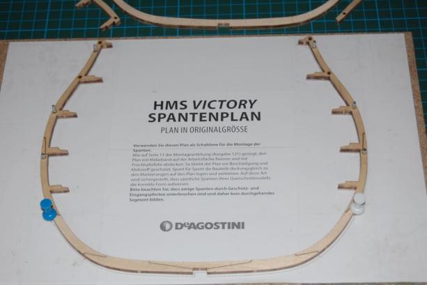 Zum Aufbau gibt es einen Spantenplan, auf welchen man die einzelnen Teile beim kleben mit Nadeln festmachen soll. Das hat mir nun nicht gefallen.