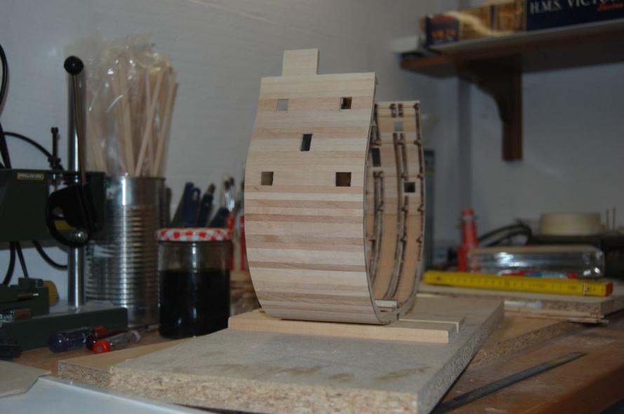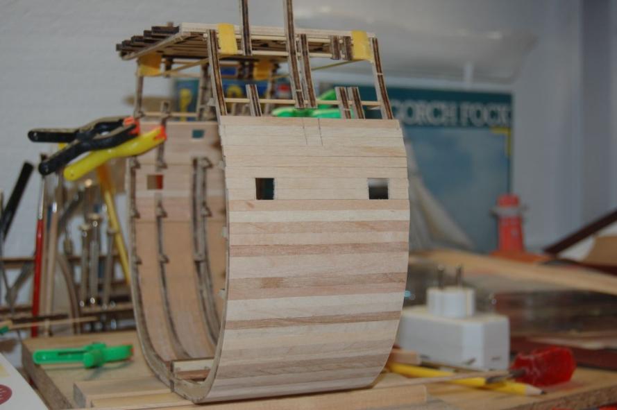 Die Aussenbeplankung ist nun bis auf die Höhe der ersten Stückpforten angebracht. Durch die unterschiedlichen Farbtöne der Leisten ergibt sich ein nicht so eintöniges Bild.
