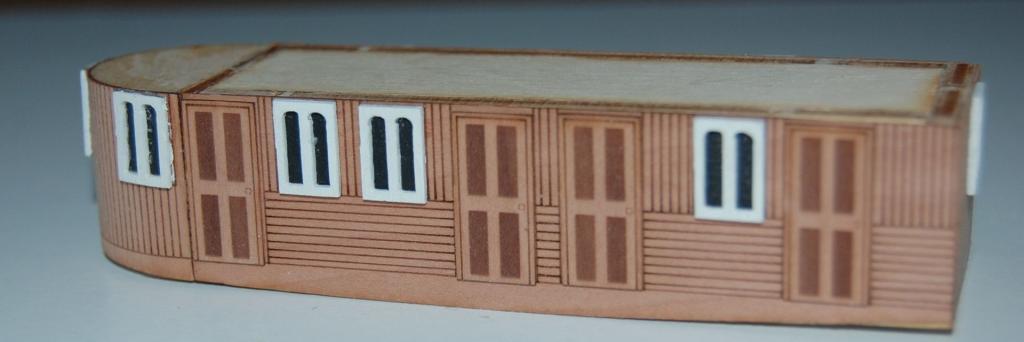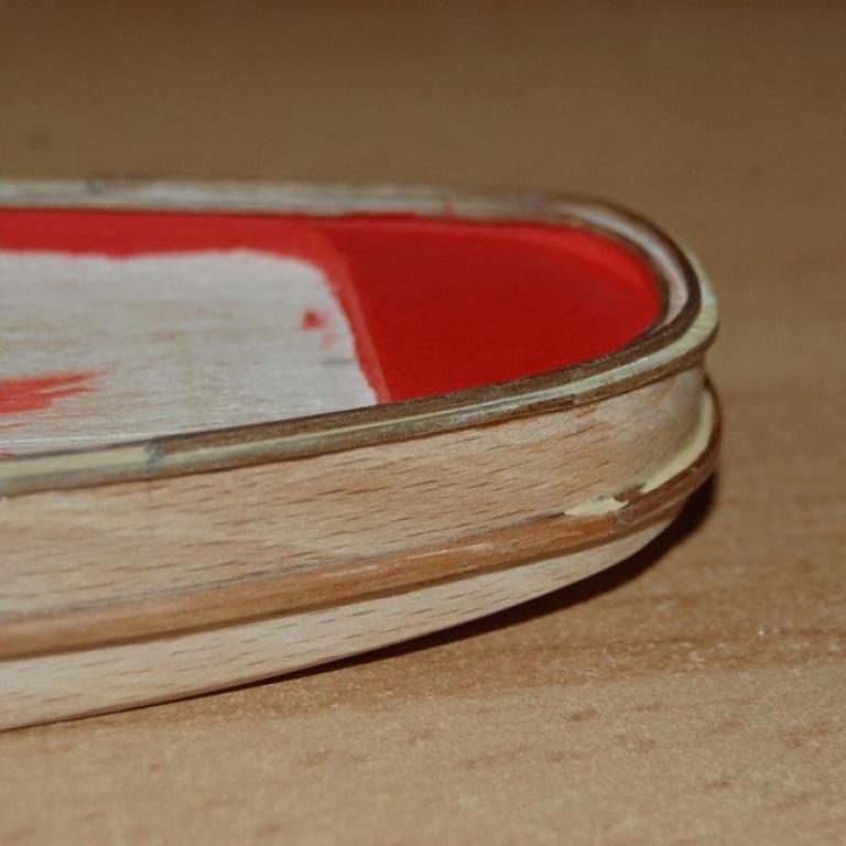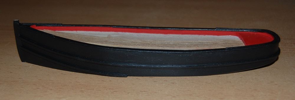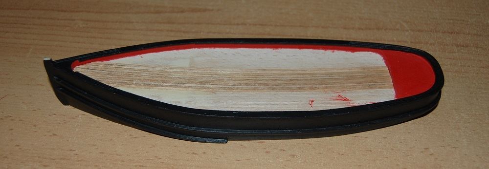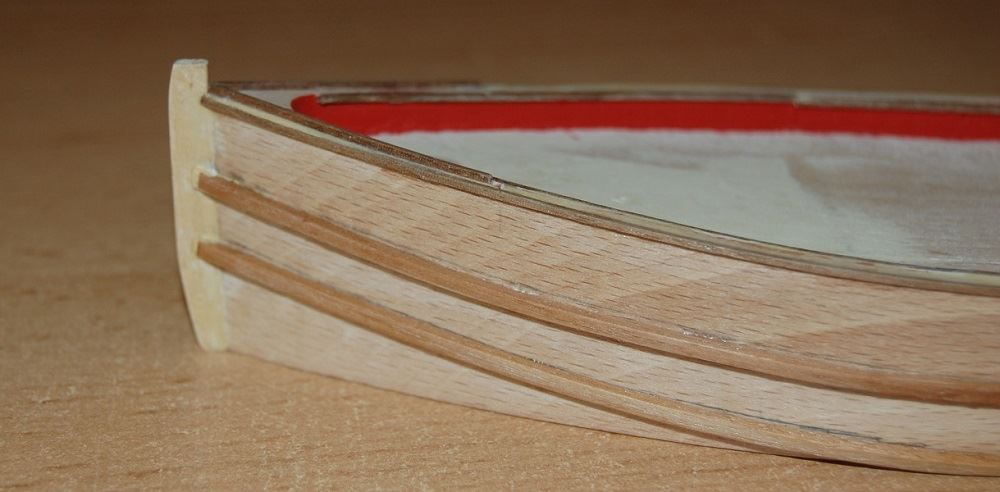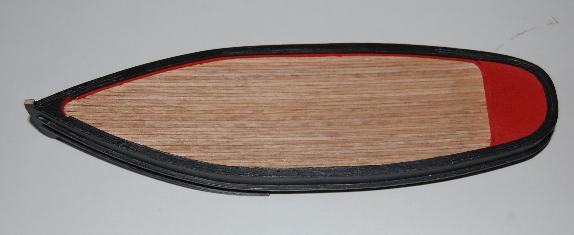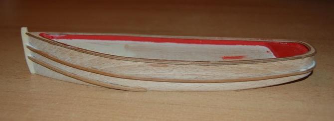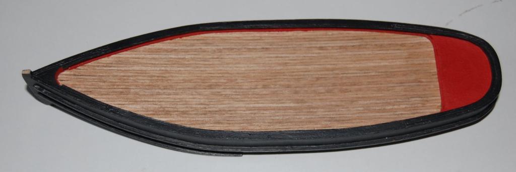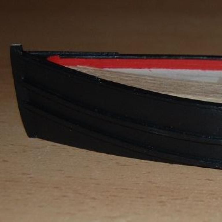 Bis jetzt habe ich die Dollbords aus 2x2 mm Leisten angebracht und die Laserteile für die Brüstung. Die Leisten 1x1 mm beidseits der Brüstung ergeben den 4mm breiten Handlauf. Die Brüstung und das erhöhte Deck sind laut Anleitung rot gestrichen. Der Rumpf bekommt einen schwarzen Anstrich.