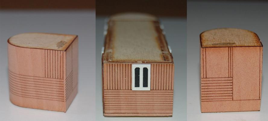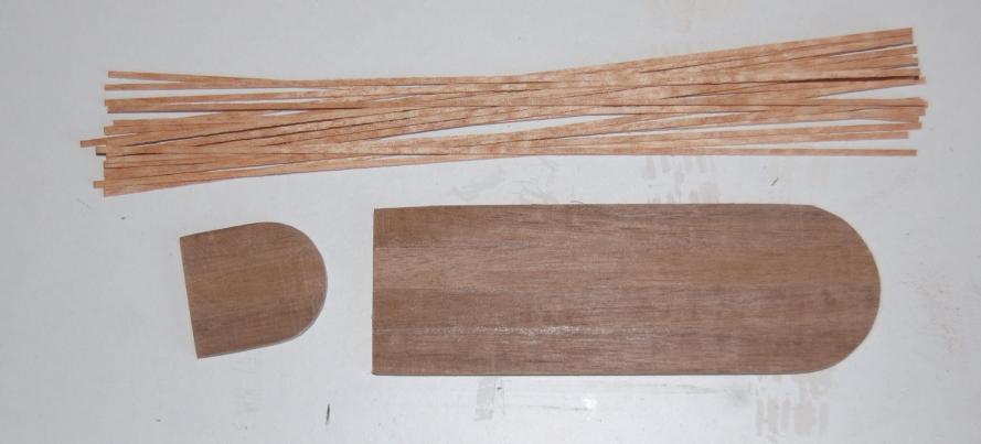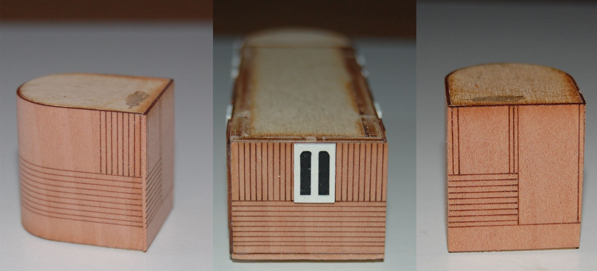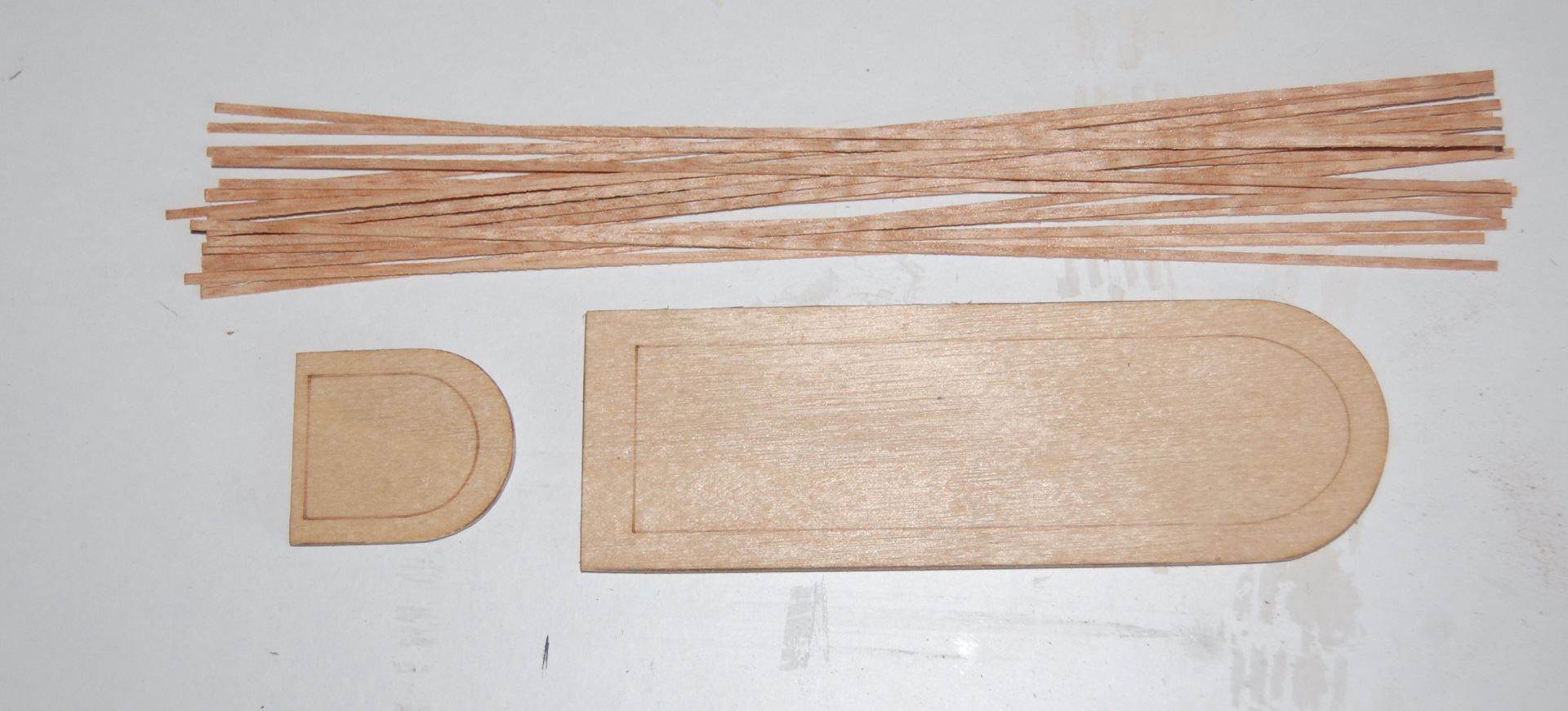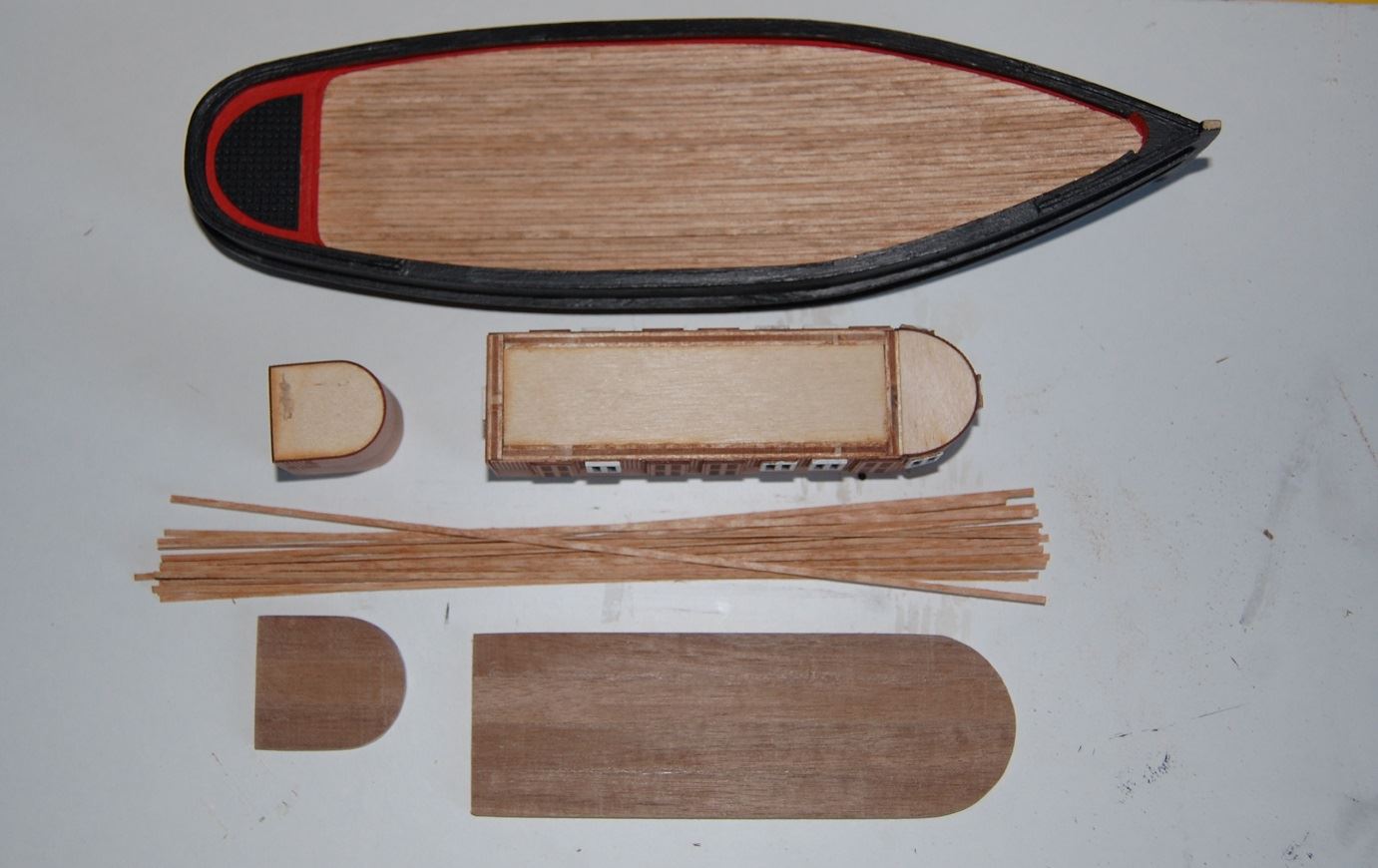 Das Deck wurde mit Leisten 2 x 0,5 mm beplankt. Eine Längsseite habe ich vor den verkleben mit dem Bleistift leicht getönt. Die beiden Deckshäuser sind gebaut und die Dächer dazu hergestellt und auch mit einem Holzdeck versehen. Die Deckshäuser bestehen aus einem Grundgerüst aus Sperrholz, auf welche die 0,5 mm dünnen Wandverkleidungen geklebt werden. Diese sehen wirklich sehr gut aus. Die Dächer bestehen aus 0,5 mm Sperrholzplatte, auf der einen Seite ist die Plazierung der Deckshäuser angedeutet und auf der anderen Seite wurden erst 2mm dicken Holzleisten aufgeklebt und darauf die feinen Decksleisten. Zum Abschluss ist noch eine ordentliche Kante drum herum gekommen. Das letzte Bild zeigt den Bauzustand bis hierhin. Den Rumpf, die Deckshäuser und die dazugehörigen Dächer, noch ohne Holzdeck.
