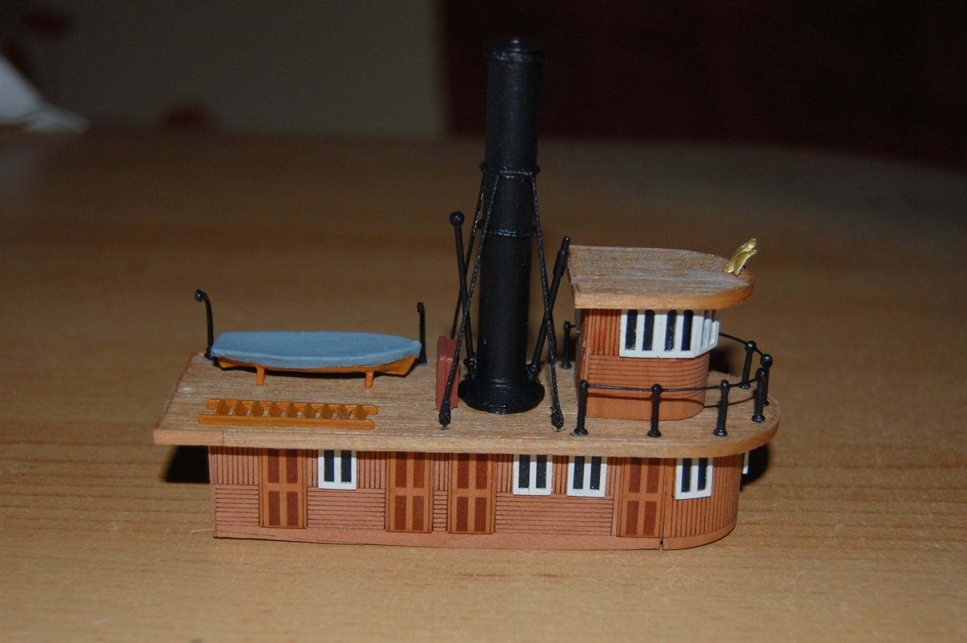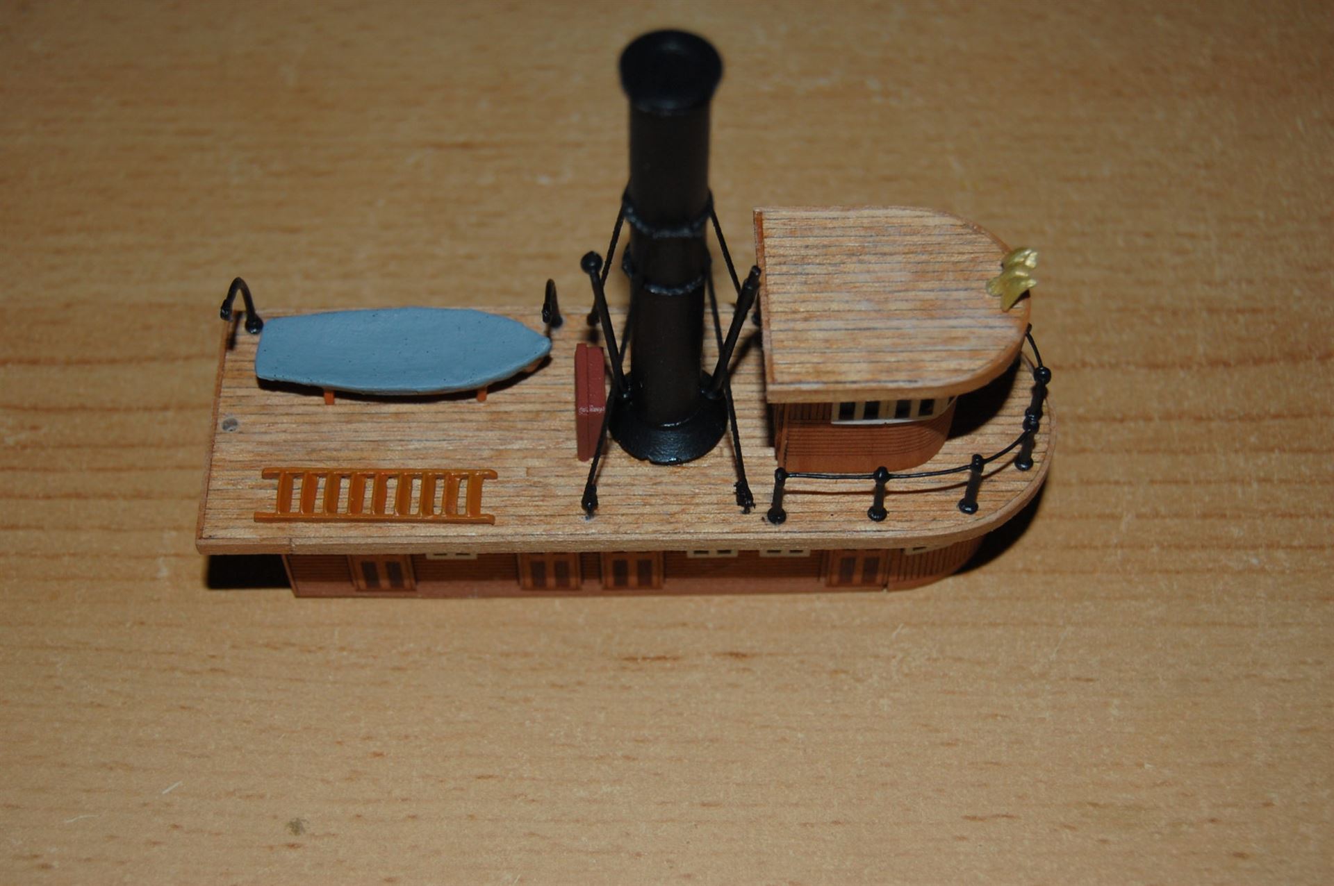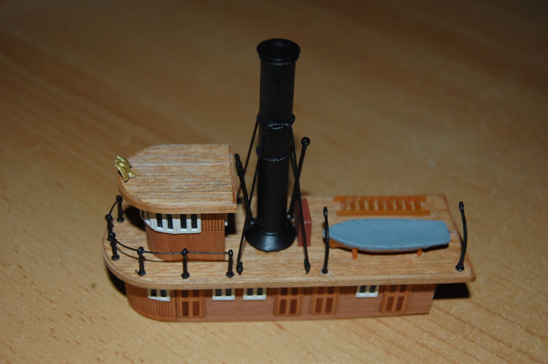Im nächsten und gleichzeitig letzten Bauabschnitt werden die einzelnen Teile der Aufbauten zu einem Aufbau zusammengefügt. Der Schornstein und alle anderen Beschlag und Zierteile kamen noch dazu. Dafür ist bei der geringen Größe doch etwas Geduld nötig. Das Ergebnis sieht aber gut aus.