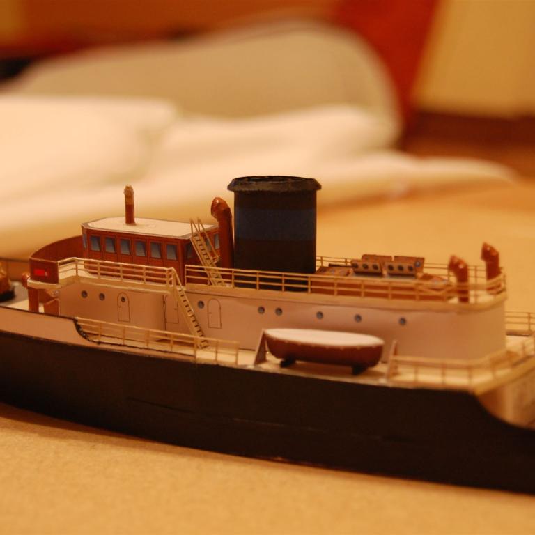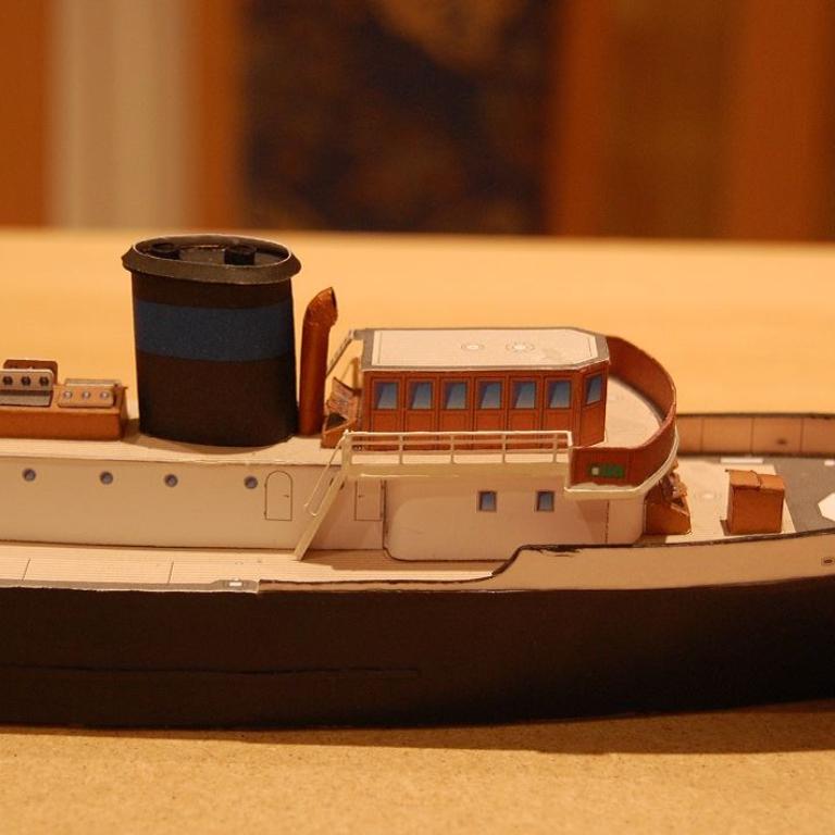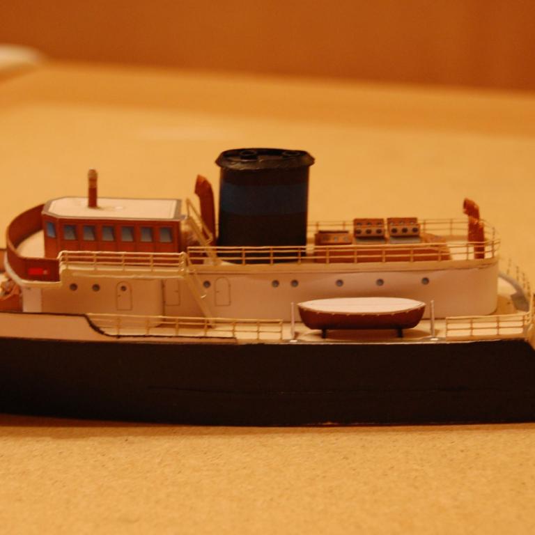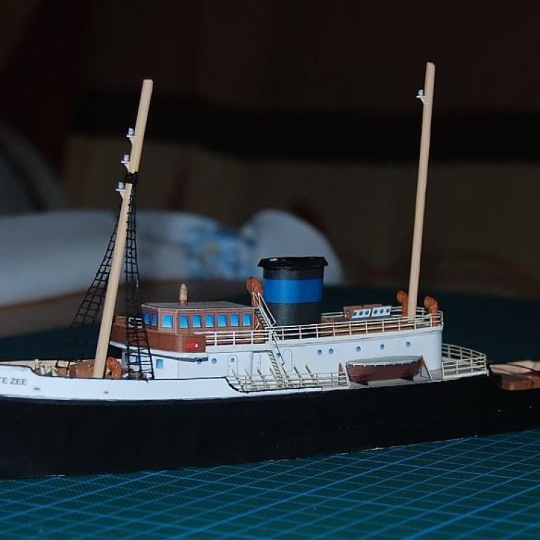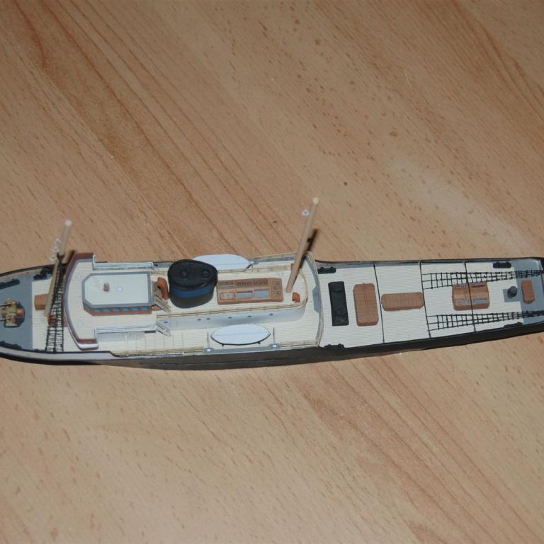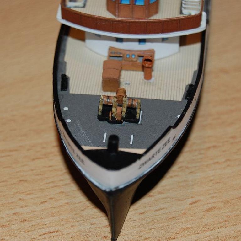 Der Bau war auch dementsprechend langwierig und kostete einige Schimpfwörter, welche hier nicht wiederholt werden. Das Ergebniss finde ich aber ist gelungen. Die Schnittkanten, welche ja nun mal hell bleiben, sind mit Wasserfarbe nachgefärbt. Am Ende wurde die Ankerwinde an Bord befestigt. Neben der Winde fanden noch einige Poller ihren vorgesehenen Platz. Diese sind nur wenige Millimeter groß und nachträglich schwarz eingefärbt. Als nächstes wurden noch einige Reelings hinzugefügt und dann die "Lebensversicherung" der Besatzung. Die Rettungsboote. An Bord sind zwei Stück vorhanden. Die Schwenkbügel zum Aussetzen der Rettungsboote fehlen noch. Die im Bogen angebotene Variante gefällt mir nicht so.