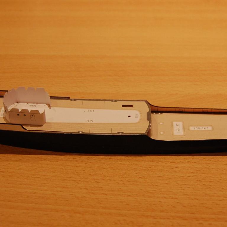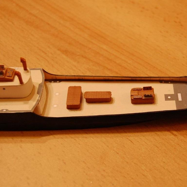 Das Ergebnis entsprach nicht so meinen Vorstellungen, so das der Rumpf noch mal gespachtelt und geschliffen wurde. Anschließend mit schwarzer Farbe überpinselt. Die angedeuteten Bullaugen sind dadurch nicht mehr zu sehen. Vielleicht kann man sie noch mal andeuten mit etwas Farbe was aber erst zum Ende gemacht wird. Das Deck besteht aus zwei Abschnitten. Als nächstes wurden die ersten Decksaufbauten erstellt und an Deck befestigt. Eine ganz schöne fitzelige Angelegenheit. Aber es ist alles zu schaffen.