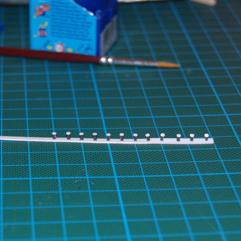Die letzten 6 Poller wurden gebaut und an Deck gebracht. Ich habe die im Bogen vorgesehenen Papierstreifen gerollt und darauf 1,5 mm große Papierkreise geklebt. Diese habe ich ausgestanzt. Die Bodenplatte der Poller war im Bogen nicht vorgesehen. Vereinfachte aber den Bau erheblich. Auf dem Heck liegen schon die "Strickleitern" für den hinteren Mast. Nun fehlen noch die Halterungen für die Rettungsboote.