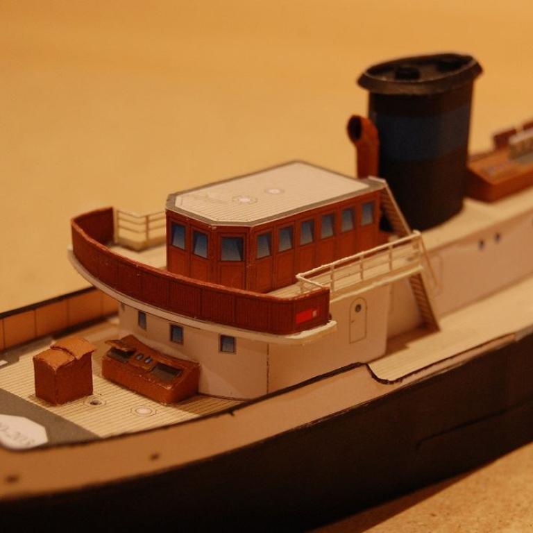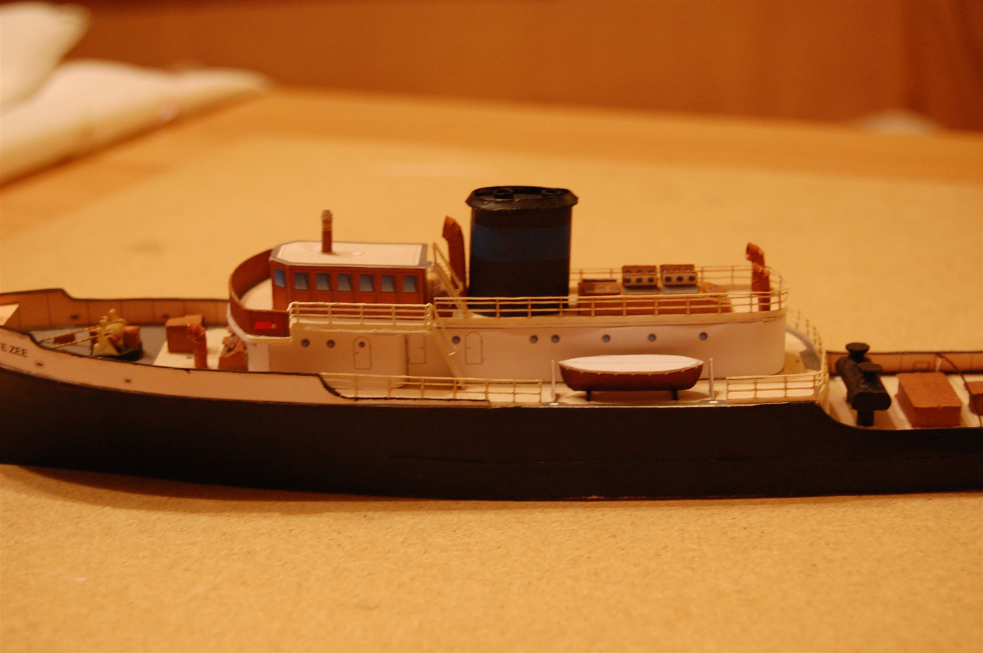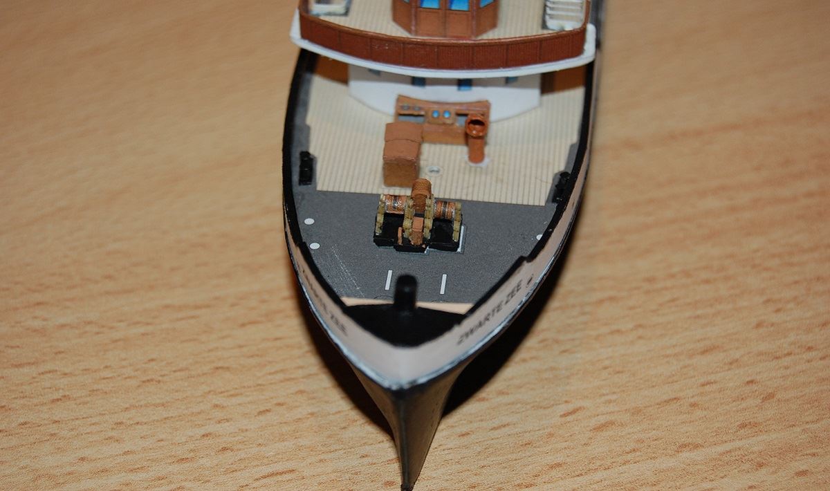 Der Bau war auch dementsprechend langwierig und kostete einige Schimpfwörter, welche hier nicht wiederholt werden. Das Ergebniss finde ich aber ist gelungen. Die Schnittkanten, welche ja nun mal hell bleiben, sind mit Wasserfarbe nachgefärbt. Am Ende wurde die Ankerwinde an Bord befestigt. Neben der Winde fanden noch einige Poller ihren vorgesehenen Platz. Diese sind nur wenige Millimeter groß und nachträglich schwarz eingefärbt. Als nächstes wurden noch einige Reelings hinzugefügt und dann die "Lebensversicherung" der Besatzung. Die Rettungsboote. An Bord sind zwei Stück vorhanden. Die Schwenkbügel zum Aussetzen der Rettungsboote fehlen noch. Die im Bogen angebotene Variante gefällt mir nicht so.