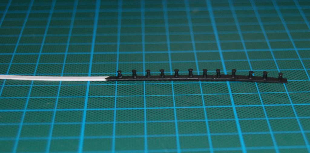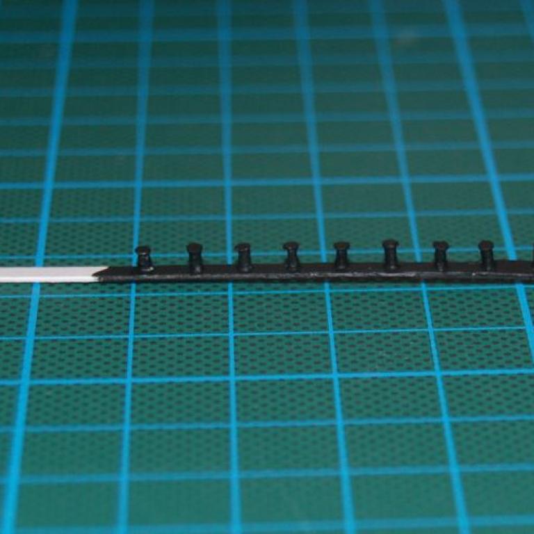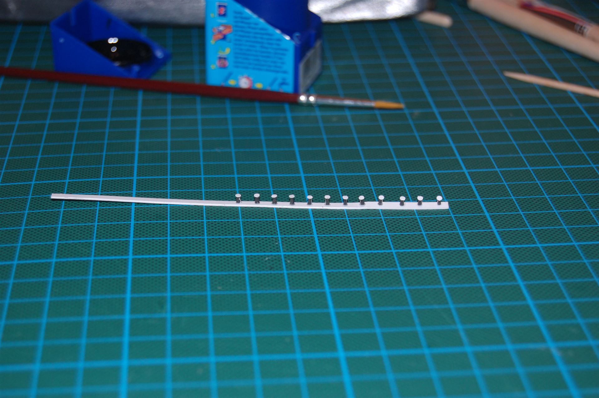 Die letzten 6 Poller wurden gebaut und an Deck gebracht. Ich habe die im Bogen vorgesehenen Papierstreifen gerollt und darauf 1,5 mm große Papierkreise geklebt. Diese habe ich ausgestanzt. Die Bodenplatte der Poller war im Bogen nicht vorgesehen. Vereinfachte aber den Bau erheblich. Auf dem Heck liegen schon die "Strickleitern" für den hinteren Mast. Nun fehlen noch die Halterungen für die Rettungsboote.