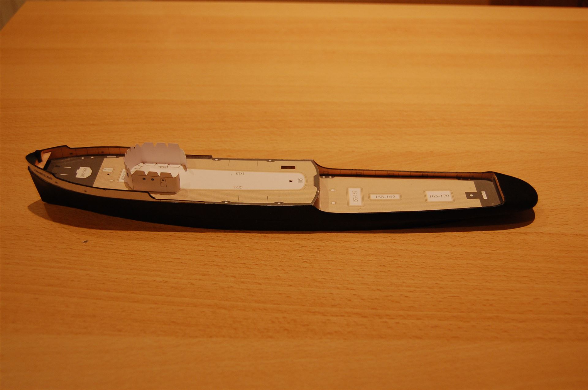 Das Ergebnis entsprach nicht so meinen Vorstellungen, so das der Rumpf noch mal gespachtelt und geschliffen wurde. Anschließend mit schwarzer Farbe überpinselt. Die angedeuteten Bullaugen sind dadurch nicht mehr zu sehen. Vielleicht kann man sie noch mal andeuten mit etwas Farbe was aber erst zum Ende gemacht wird. Das Deck besteht aus zwei Abschnitten. Als nächstes wurden die ersten Decksaufbauten erstellt und an Deck befestigt. Eine ganz schöne fitzelige Angelegenheit. Aber es ist alles zu schaffen.