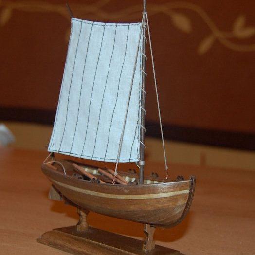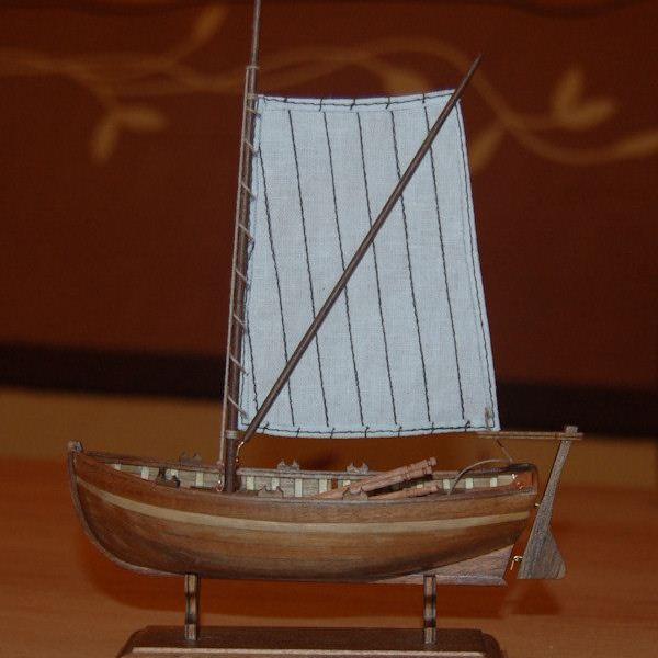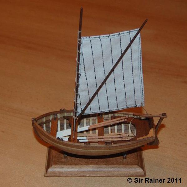 Den mitgelieferten Holzstab zur Herstellung des Mastes war nicht zu verwenden. In der Mitte war ein Ast und genau an diesem ist er gebrochen. Im eingepackten Zustand sieht man das nicht. Ein anderer Holzstab in den Dremel gespannt und abgeschliffen, ergab nun den neuen Mast. Die Farbe des Holzes (dunkel) passte auch gleich. Nun noch die Ruder dazu gebaut und das Segel gesetzt und das kleine Arbeitsboot ist fertig.